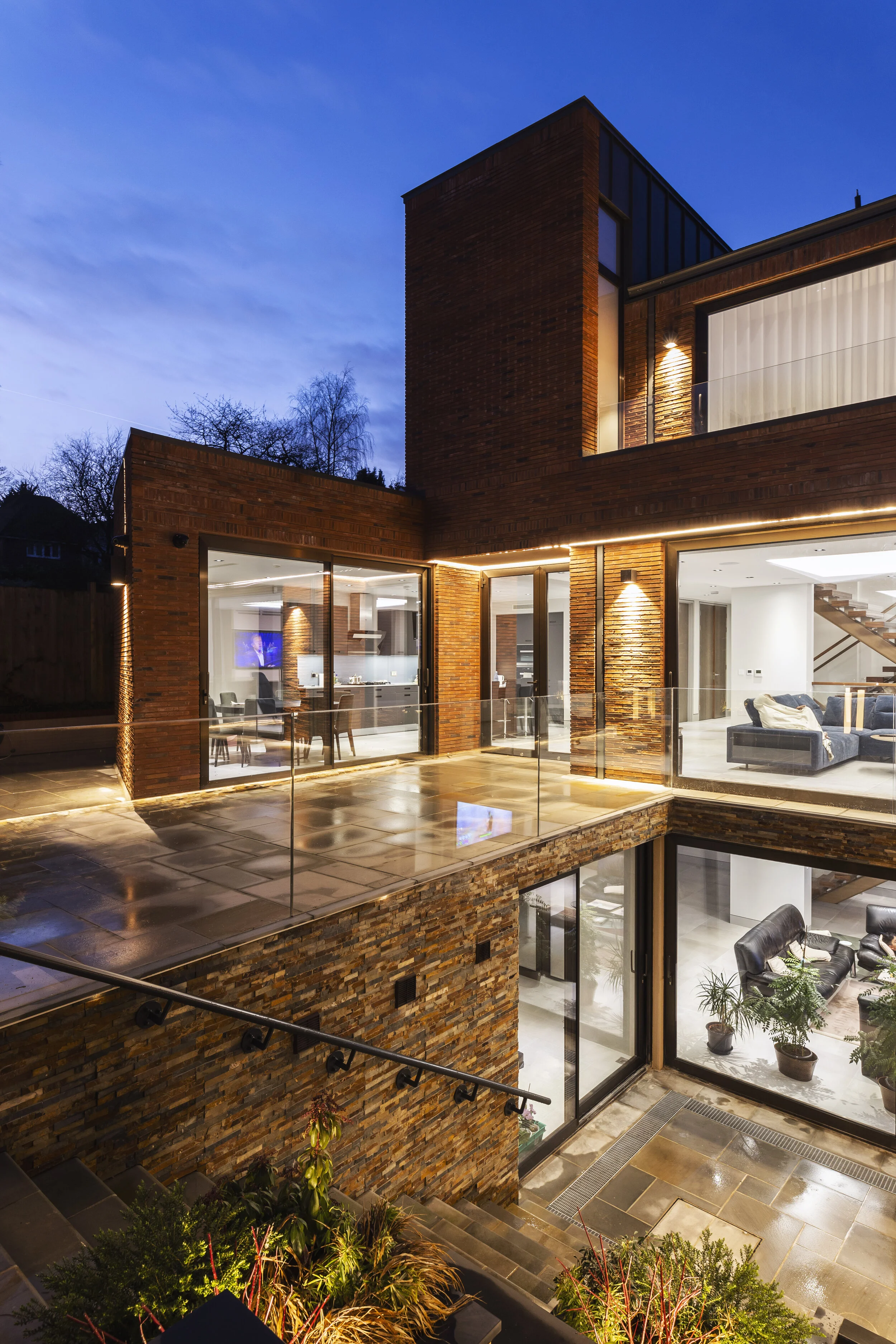 Square Feet Architects have designed a new house for a contractor, for himself and his family, on a plot of land in Elstree, North London. It was conceived to cater for multi-generational extended family living and expansive entertaining. The house is based on a cruciform plan with primary, secondary and circulation spaces informally defined in space and structure. The exterior uses a traditional contextual material – brick – in a modern, sculptural form together with expansive areas of glass bringing great light and views onto the re-landscaped rear garden.