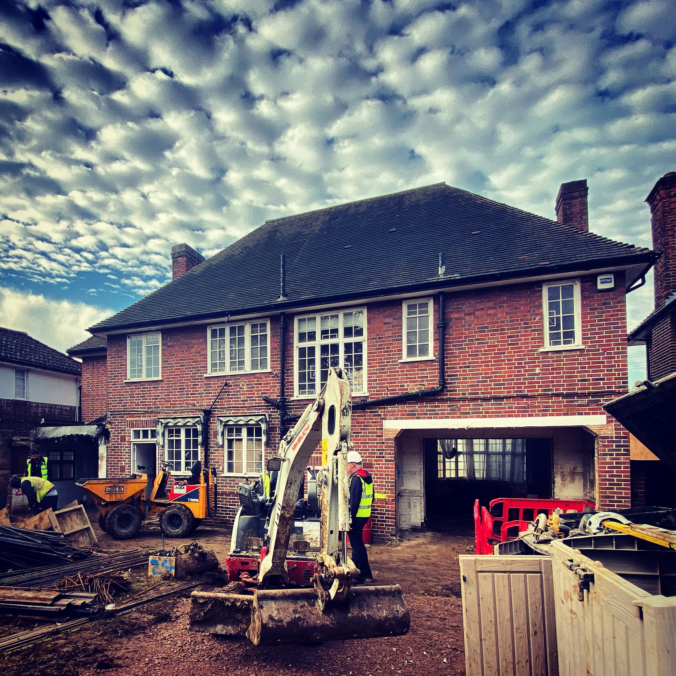 Works progressing nicely to create a new basement under this existing house, as a first phase, then to largely completely rebuild the upper parts, all in close compliance with The Hampstead Garden Suburb Trust approvals.
