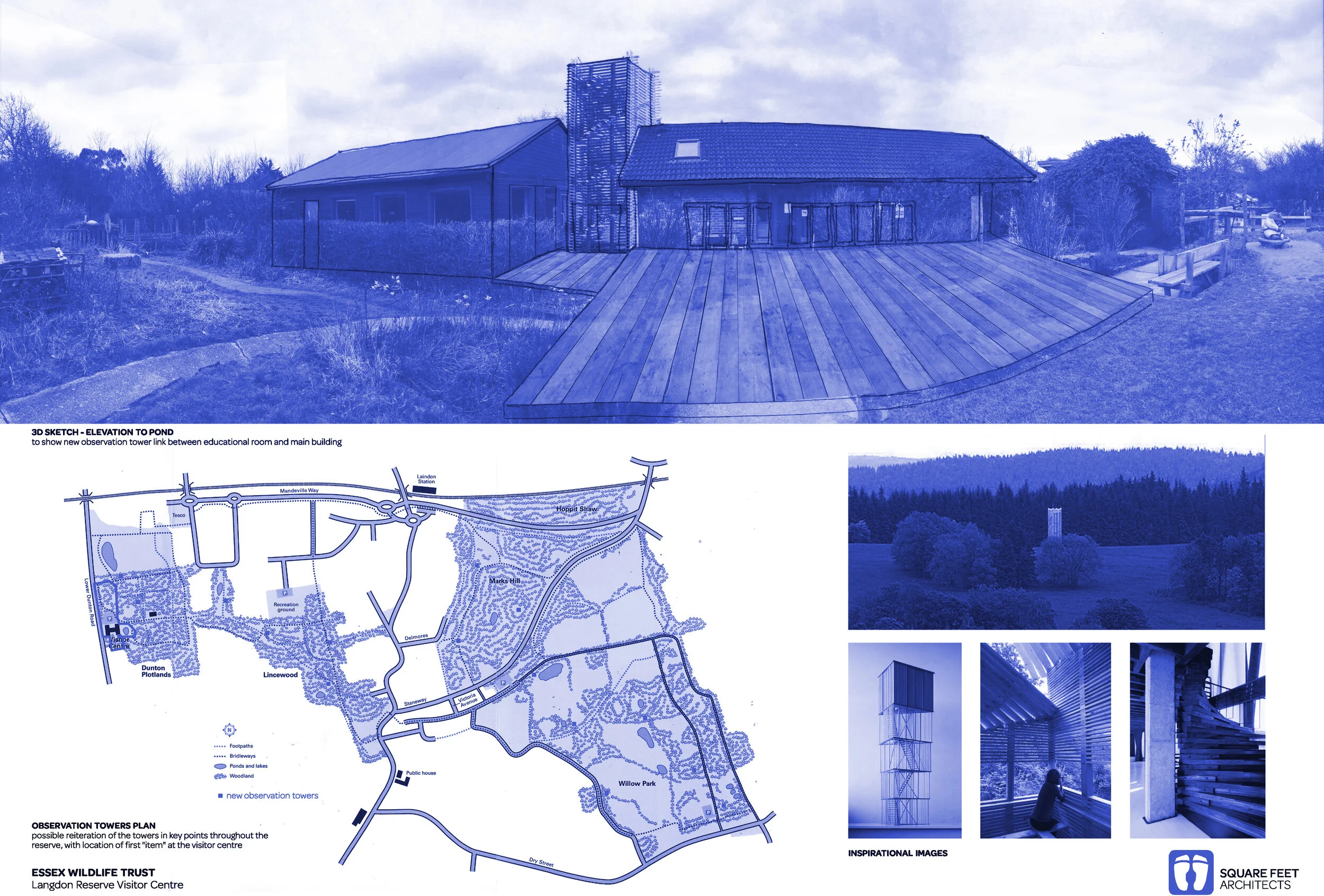 Designs for overhauling a visitors centre, taking its context as inspiration, the timber found on site and flat vast landscape, to set a series of ‘jenga’ towers as observation towers and bird hides across the site.